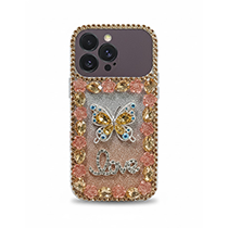 Adorn your iPhone with this dazzling, hand-decorated phone case, featuring a shimmering glitter base and an intricate arrangement of sparkling rhinestones. The design is centered around a beautiful three-dimensional butterfly and the word "Love," framed by elegant rose-shaped accents and brilliant a...