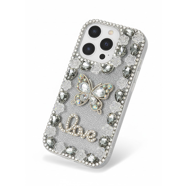Adorn your iPhone with this dazzling, hand-decorated phone case, featuring a shimmering glitter base and an intricate arrangement of sparkling rhinestones. The design is centered around a beautiful three-dimensional butterfly and the word "Love," framed by elegant rose-shaped accents and brilliant a...